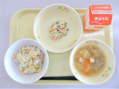 たけのこごはん、バンバンジーサラダ、豚汁、牛乳