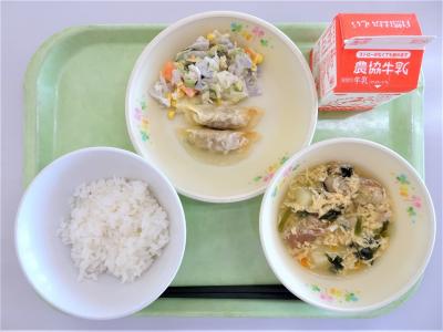 ごはん、焼きギョウザ、れんこんサラダ、卵とじ、牛乳