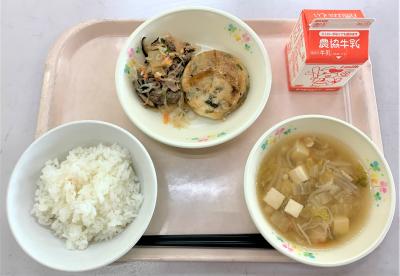 ごはん、イカと野菜のチヂミ、しらたきのチャプチェ、とり野菜、牛乳