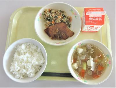 ごはん、サバの南蛮漬け、切干大根のピリ辛炒め、めった汁、牛乳
