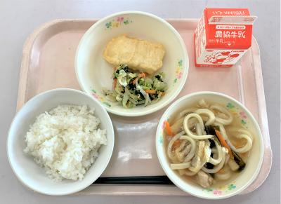 ごはん(少なめ)、五目うどん、いか天ぷら、お浸し、牛乳