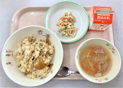 キムタクごはん、せん切りスープ、かみかみサラダ、牛乳