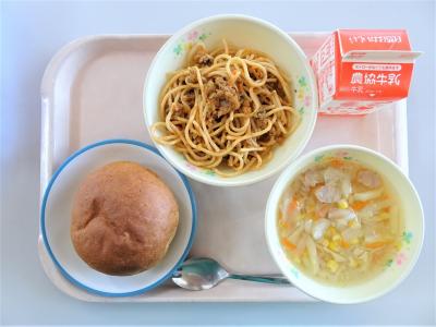 はいがバンズ、夏野菜のミートソーススパゲティ、コンソメスープ、牛乳