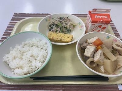 ごはん(ひゃくまん穀)、いわしのみぞれ煮、切干大根の煮物、のっぺい汁、牛乳