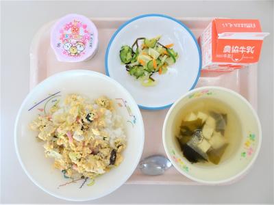 ごはん、鶏肉とれんこんの中華炒め、たまごスープ、牛乳