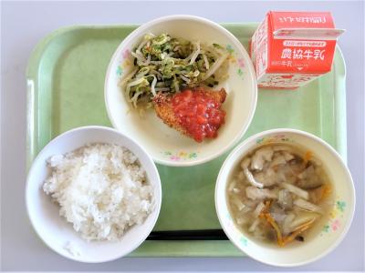 ごはん(ひゃくまん穀)、チキンカツのトマトソースがけ、きゅうりのピリ辛あえ、なすと油揚げのみそ汁、牛乳