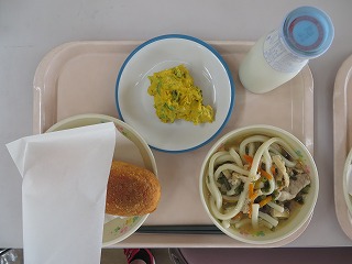 きなこパン 山菜うどん かぼちゃサラダ 牛乳