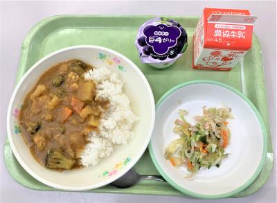 チキンカレー、もやしの中華和え、巨峰ゼリー、牛乳