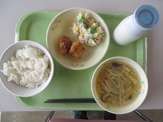 ごはん 鶏の唐揚げ ポテトサラダ みそ汁 牛乳