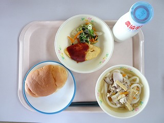 バターロール、オムレツ、おひたし、肉うどん、牛乳