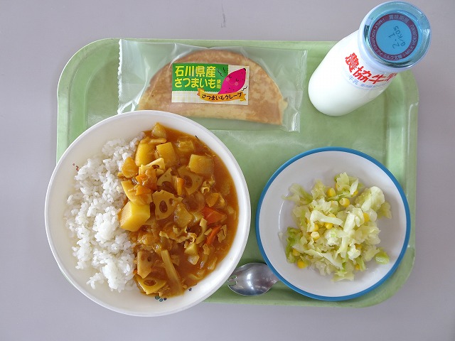 冬野菜カレー、花野菜サラダ、さつまいもクレープ、牛乳