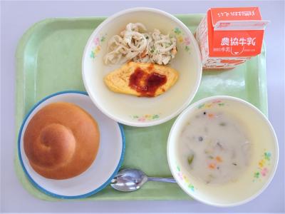 ミルクロール、オムレツ、切干のごまマヨ和え、アスパラシチュー、牛乳
