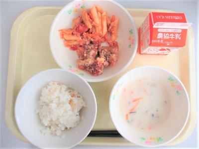 ごはん、とりのからあげ、ペンネアラビアータ、きのこのポタージュ、牛乳