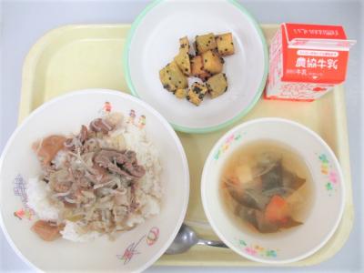 おもてなしのための、ご馳走は、山や田でとれた、さといも、きのこ、たいこん、にんじん、豆などと使って料理します。魚は本来尾頭付きを使いますが、給食では、地元のふくらぎを使いました。