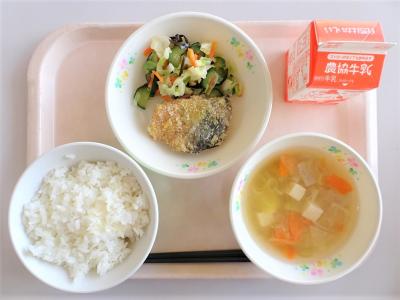 ごはん(ひゃくまん穀)、サバのカレー揚げ、塩昆布あえ、さつま汁、牛乳