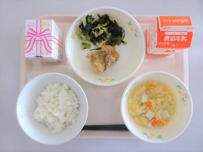 ごはん,ユーリンチー,チョレギサラダ,かきたま汁,お祝いデザート,牛乳