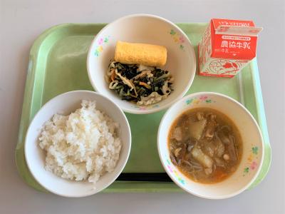 ごはん、だし巻き卵、小松菜の煮びたし、韓国風肉じゃが、牛乳