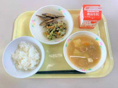 ごはん(ひゃくまん穀)、豆アジの甘辛、礒香和え、ピリ辛豚汁、牛乳