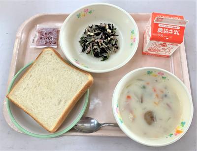 食パン、ミートボールのクリーム煮、ひじきサラダ、いちごジャム、牛乳