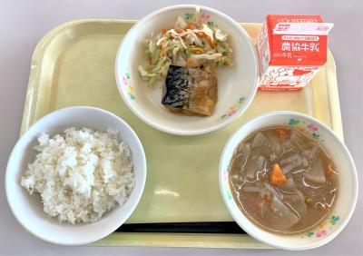 ごはん、だいこんのそぼろ煮、サバのみそ煮、キャベツのごま酢和え、牛乳