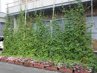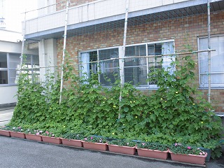 校務員さんが毎日お世話をしてくれています。今年も立派なグリーンカーテンになりそうです。