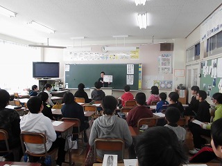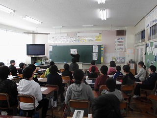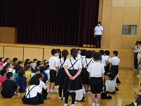 全校集会では,読み聞かせボランティアの方々による「平和についてのお話」がありました。大型スクリーンに映し出される挿絵と,背後で奏でられるピアノ演奏と共に語られるお話に,子供たちは聞き入っていました。