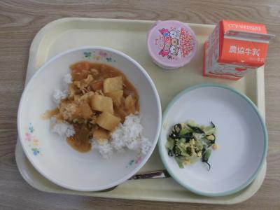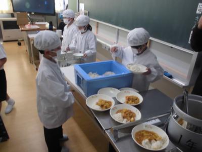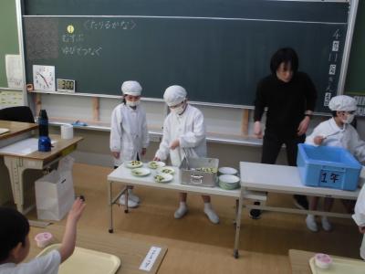 今日から一年の給食が始まりました。頑張って当番の仕事もできました。メニューは子ども達が大好きなカレーです。お祝いゼリーもついて、笑顔いっぱいの給食の時間でした。