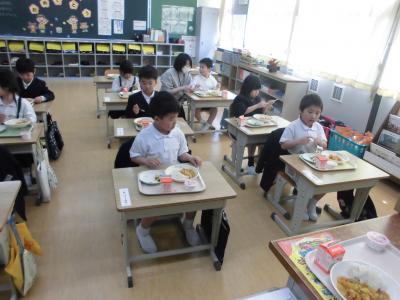 今日29日の給食は、たけのこご飯、厚焼きたまご、ツナとひじきのサラダ、ジャガイモと玉ねぎの味噌汁、牛乳です。子ども達は「たけのこ大好き!」と言いながら、今が旬のたけのこご飯をおいしそうに食べていました。