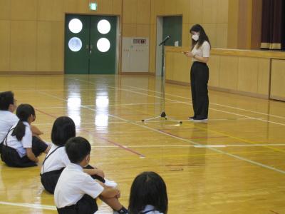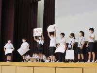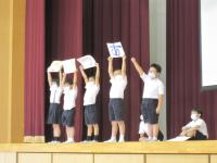 7月6日、全校集会で3年生が学年発表を行いました。今回は国語で学習した言葉遊びの発表です。回文やクイズなどをわかりやすく、大きな声で発表してくれました。次回の2年生の発表も楽しみです。