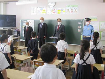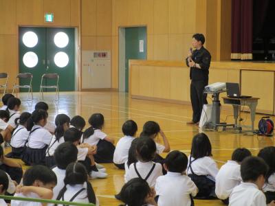6月8日、不審者対応の避難訓練を実施しました。訓練後の集会では、警察の生活安全課の方から、校内だけでなく校外で不審者に出会ったときに、自分の身を守るために何ができるかについて学びました。