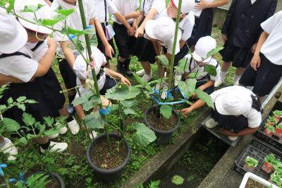 今日はみんなで、生活科で育てている野菜を収穫しました。自分達が育てた野菜の収穫に大喜びの子どもたちの笑顔がうれしい時間でした。