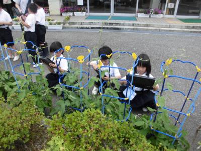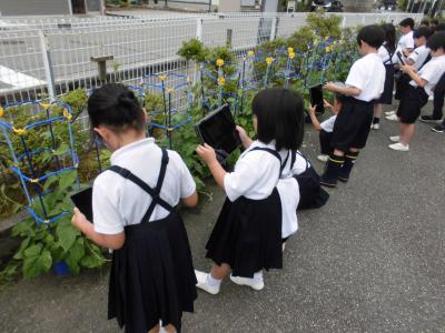 今日、1年生は初めてパソコンで育てている朝顔の写真を撮りました。まだ使うことに慣れない一年生は、「写真撮ったよ、見て、見て!」と大喜びでした。これからも大切に授業で使ってくれると嬉しいです。