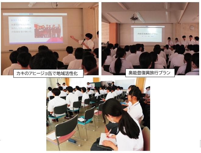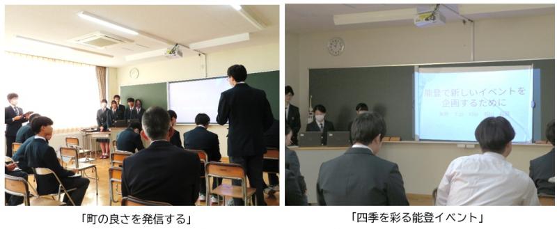 初めに本校生徒による探究活動の発表が行われました。「奥能登復興旅行プラン」と題して、仮設住宅を利用した宿泊施設の観光利用について3年生1グループが発表しました。