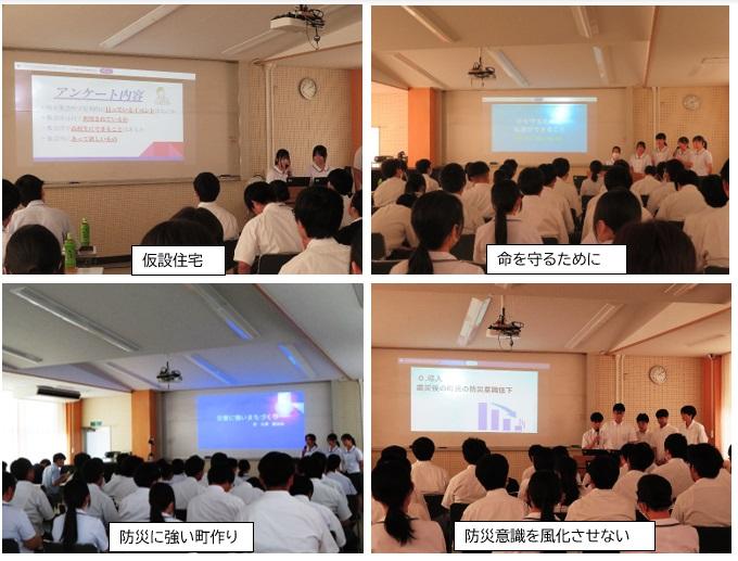 7月9日(水)、「総合的な探究の時間」の3年間の総まとめとして、3年生による最終成果発表会が行われました。 「奥能登復興旅行プラン」「命を守るために」「仮設商店街」「防災意識を風化させない」など、地域の活性化や復興をテーマに7グループに分かれ発表しました。