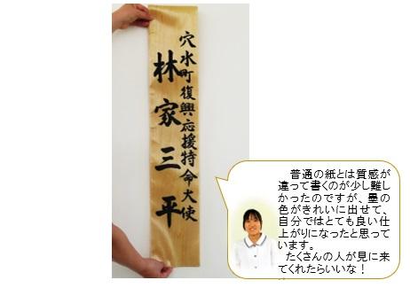 7月19日(土)に穴水町で行われる「第63回長谷部まつり」で、武者行列の先導役を務められる林家三平さんが穴水町復興応援特命大使に任命されることとなり、本校2年の井上心乃さんが、木で作られた特製のたすきに林家さんの名を書き入れました。