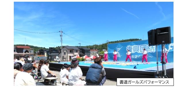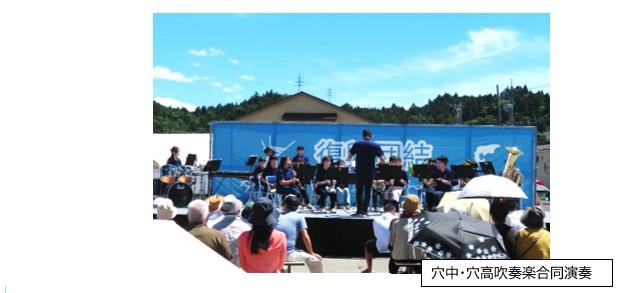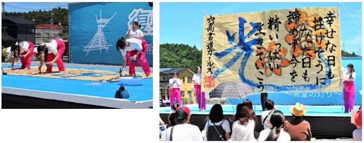午前中のステージイベントでは、穴水中学校吹奏楽部と本校吹奏楽部が合同で演奏を行い、オープニングを盛り上げました。その後、書道ガールズが穴水産の木で出来た特製の用紙に復興を願い「光」と大きく書き上げました。駅前マルシェでは生徒達が夏野菜や牡蠣のアヒージョ缶、「H&M」特製「のと115」入りのパンなどの販売を行いました。