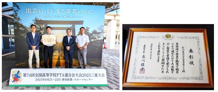 1日目は表彰式と4分科会に分かれた意見交換会、2日目は井村屋株式会社会長中島伸子氏による記念講演が行われました。表彰式では優良PTA文部科学大臣表彰27団体が選ばれ、本校PTAが表彰を受けました。