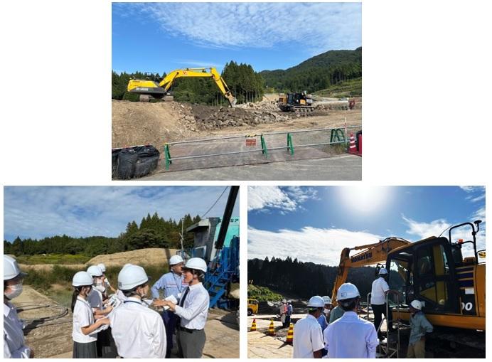 生徒達は実際の工事の様子を見学し、「作業には無人操作できるものもあり、土木はきつくて大変そうだというイメージが変わった。現場の人が安全に作業を進められるように配慮されているのだなと思った。」「復旧の様子がスマホでも見られるようになっているということは知らなかった。色々新しいことを取り入れているのだなと思った。」などと述べ、最先端の技術を駆使して工事が行われていることや工事の進捗状況の発信などについて新たに学んだことも多く、非常に有意義な見学会となりました。