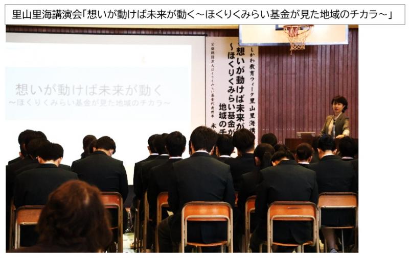 午前中は1、2年生による「総合的な探究の時間」中間発表会が行われ、午後からは、「想いが動けば未来が動く~ほくりくみらい基金が見た地域のチカラ~」と題して公益財団法人ほくりくみらい基金代表理事、永井三岐子氏による里山里海講演会が行われました。