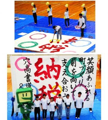 11月11日(土)、「税を考える週間」に合わせ、税をテーマにした啓発活動の一環として輪島市総合体育館で行われたイベントに本校書道ガールズ&ボーイが出演し、パフォーマンスを披露してきました。