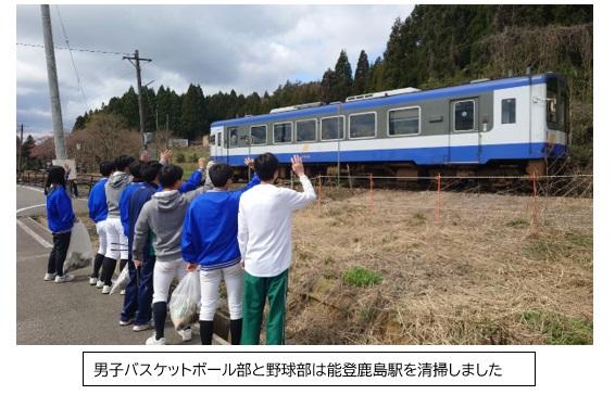 昨年度は地震の影響で実施出来ませんでしたが、今年度は本校生徒と教職員約65名が部ごとに分かれ、穴水町内やのと鉄道駅周辺のゴミ拾いを行いました。町民の皆さんから励ましの言葉をいただきながら約2時間一生懸命清掃に励みました。