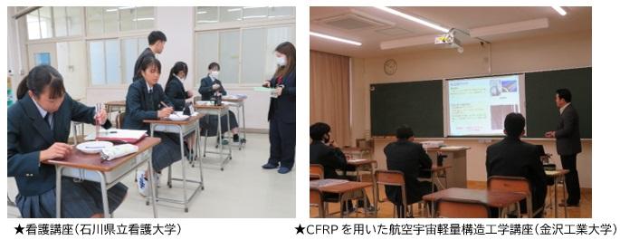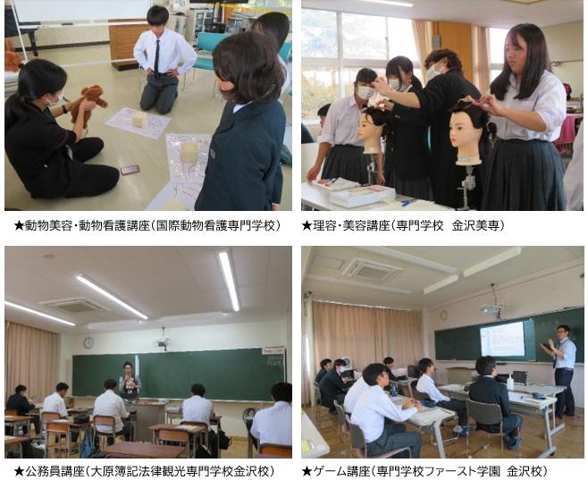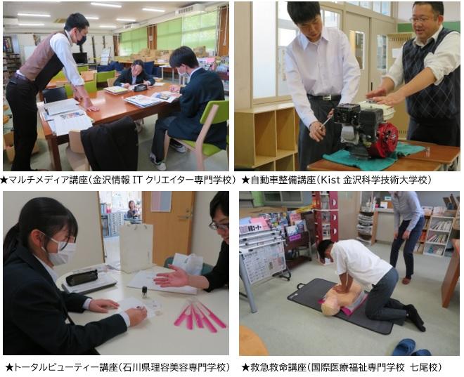 金沢工業大学によるCFRPを用いた航空宇宙計量構造の紹介、金沢情報ITクリエイター専門学校によるデザイン・イラスト講座、石川県立看護大学による食生活を支える看護講座、スーパースイーツ製菓専門学校によるマカロン体験、Kist金沢科学技術大学校によるエンジンの仕組みと組み立ての講座など分野別に19の講座が開講され、生徒達は自分の興味のある分野を受講しました。