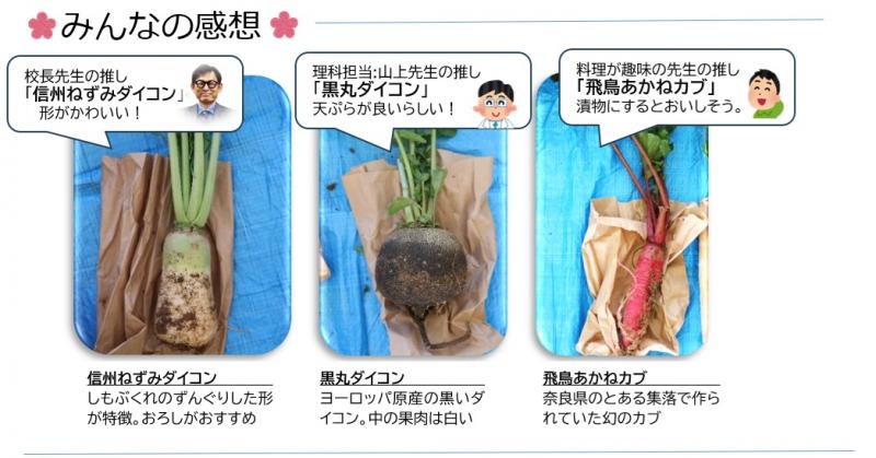 生徒たちは玄関にたくさん並べられているダイコンやカブを見て、変わった形や色とりどりの野菜を見て「食べたらどんな味がするのかな」「赤いダイコンを初めて見た!」などと話し、興味深そうに見たり触ったりしていました。