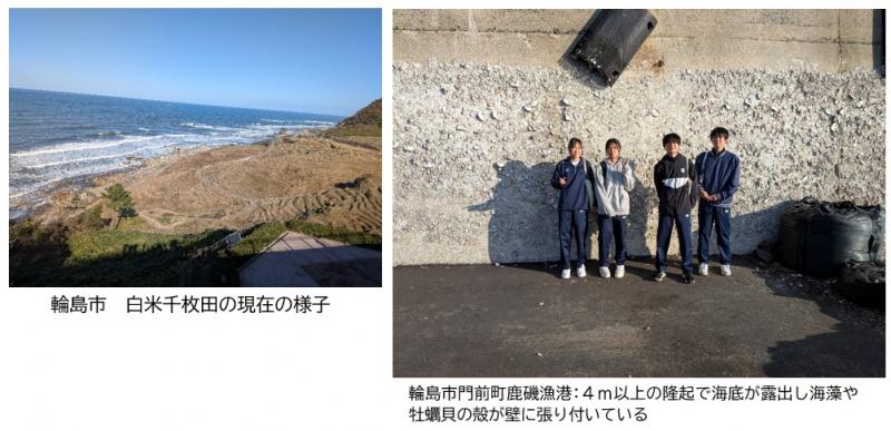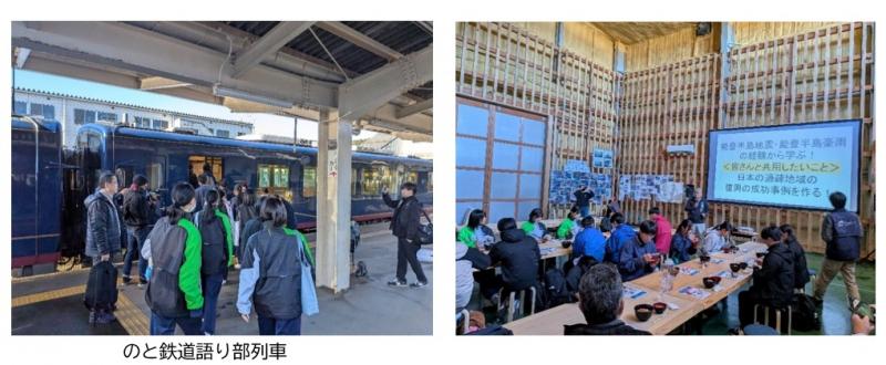 のと鉄道震災語り部観光列車に乗りながら、地震を体験した生の声に耳を傾けました。「ココハサトマチ」で昼食をとり、その後輪島市の千枚田や、地震後に海底が隆起した海岸、朝市通りの焼け跡を見学し、輪島市職員の方の体験談を聞くなど、現地の生々しい地震の傷跡を目の当たりにしました。