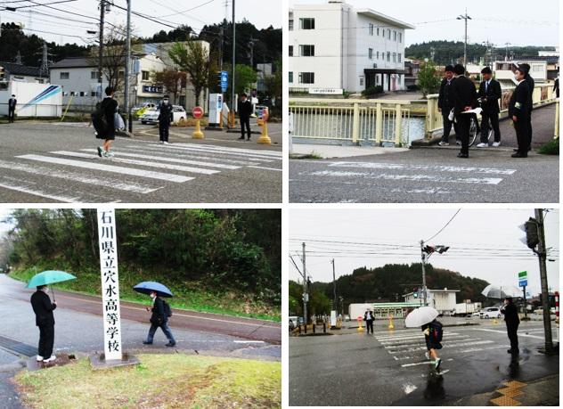 4月11日(火)から交通安全指導を行っています。新年度に入り、新入生や2,3年生の登校マナーをあらためて確認するため、本校生徒指導課を中心に穴水町内の主要交差点で挨拶と交通安全マナー指導を実施しています。元気な挨拶で今日も一日頑張りましょう!