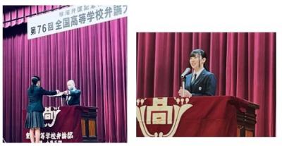 入賞はなりませんでしたが、奨励賞を受賞し、片岡さんは「自己ベストといえるくらい自分では満足のいく発表ができたと思います。全国総文は弁論のレベルが高く表現力の素晴らしさに圧倒されました。次回の大会ではもっと練習し、さらに上をめざしてがんばりたいと思います。」と述べ、今後の大会に意欲を見せていました。
