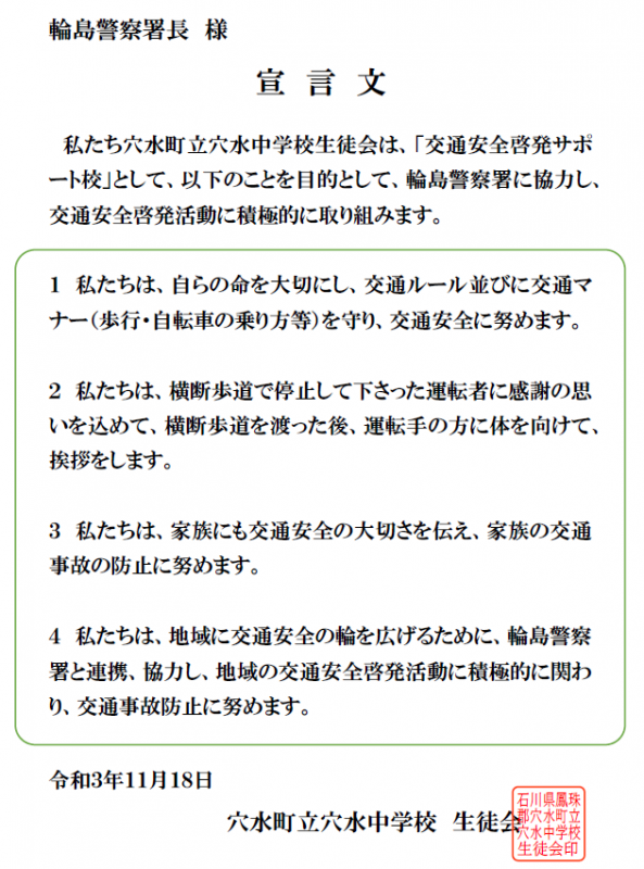 3年前から、生徒のために本校周辺の交通安全対策として、横断歩道や緑色歩道、信号機の設置など交通安全への環境整備をしていただきました。その整備を受けて、私たち生徒自身が交通安全にしっかり向き合う番であると考え、後期生徒総会総会で「交通安全サポート校宣言」が決議されました。今後、輪島警察署穴水庁舎に協力し、交通安全啓発活動に積極的に取り組んでいきます。
