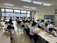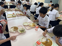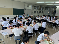 学年のみんなと向かい合って,おいしい給食をたくさん食べています。