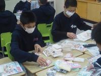 関連グッズの中には、事前に2年生が作成した手書きの「高齢者に優しいゆずりあい」などの標語とイラストの入ったカードが入っています。そのカードは、野球部員が袋づめして配布の準備を進めてきました。ただ、配付するだけでなく、心のこもったものにしようと取り組んでいます。
