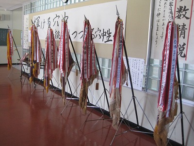 部活をしていて,悔しいこと,つらいこともあったでしょう。 でも,それを乗り越えたからこそ,これだけの優勝旗が並んでいるのだと思います。。